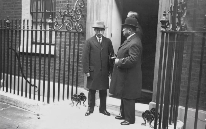1934年9月,山本五十六被任命为伦敦海军裁军预备会议日本方面的海军首席代表,出使英国。图中左为山本五十六在伦敦唐宁街10号外