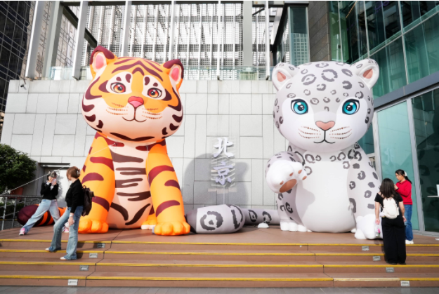 北京国贸商城六层露台上覃伟立创作的东北虎、雪豹大型气模